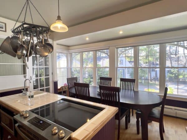 The spacious first-floor kitchen features a large island perfect for meal preparation. Multiple cooks can work together without bumping elbows. The dining table accommodates your entire party, so no one eats in shifts or at the kids’ table in another room. After dinner, gather in the living room by the gas fireplace. The bay windows overlooking the property provide natural light that makes your celebration feel warm and inviting.