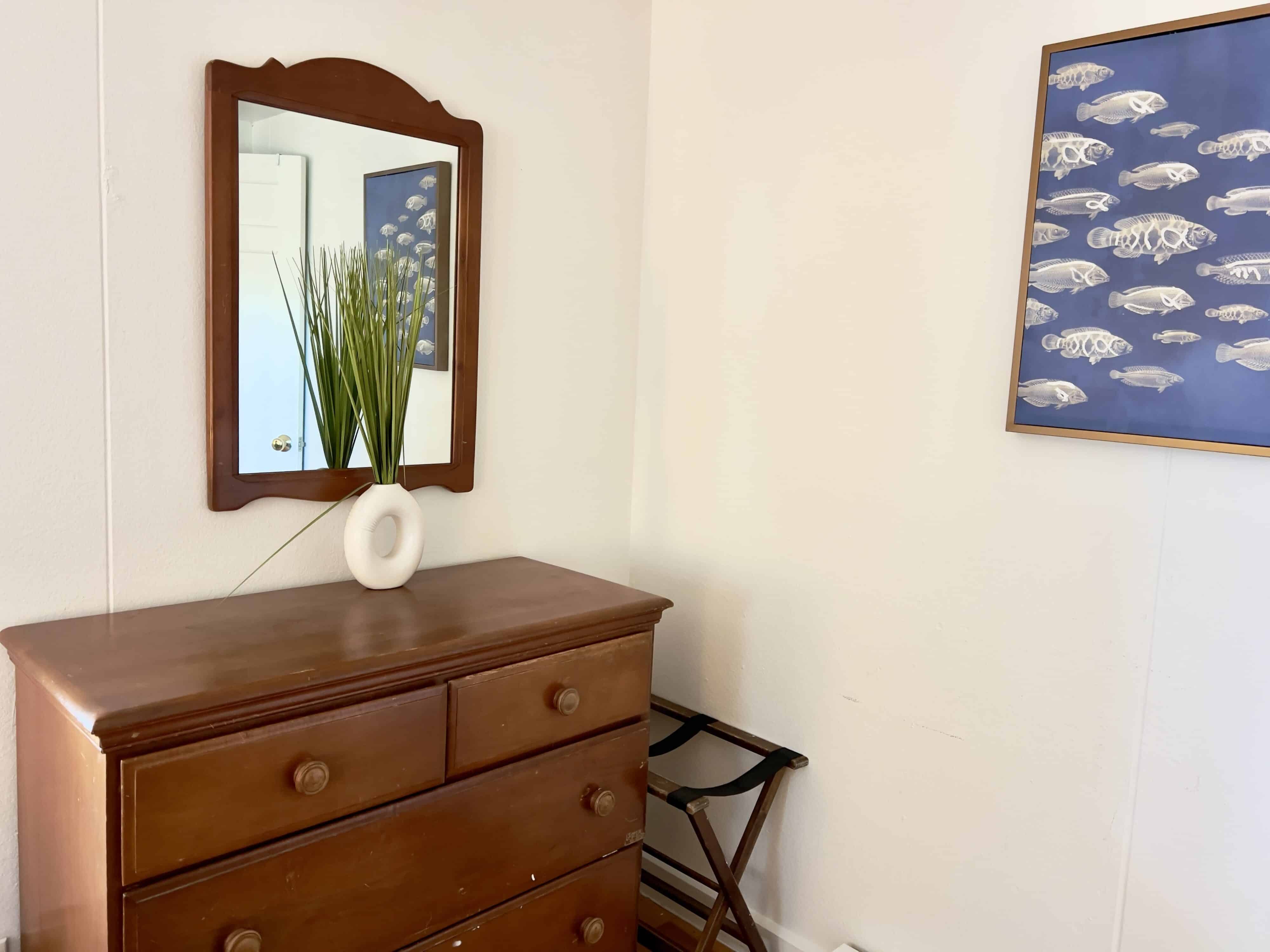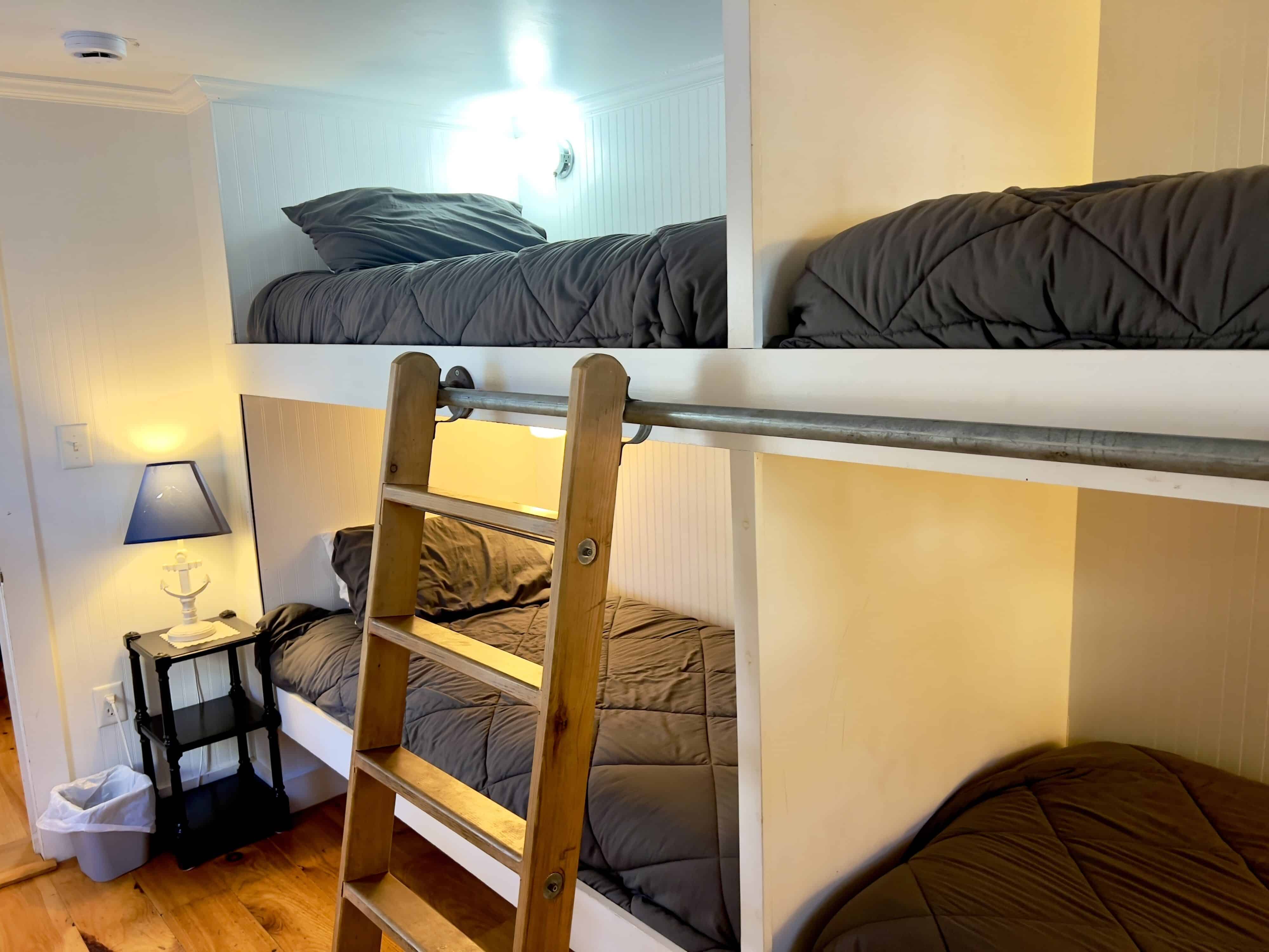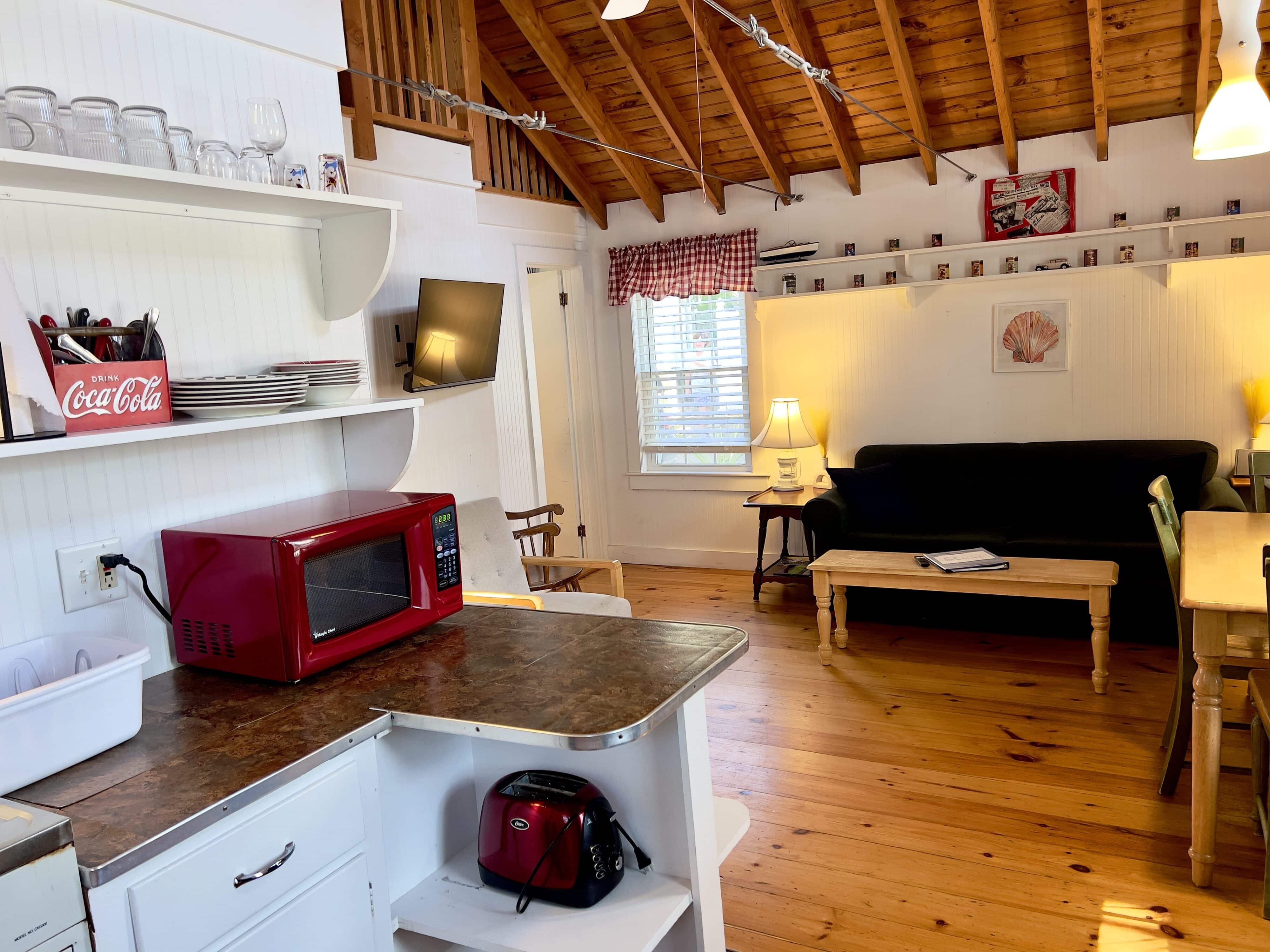 This charming cottage features two bedrooms. One bedroom has a queen bed and one has two bunk beds, for a total of 6 people maximum. The open kitchen, dining, living room area has cathedral ceilings. The bathroom offers his & her sinks, shower and whirlpool tub. Kitchen amenities include 2 hot plates.