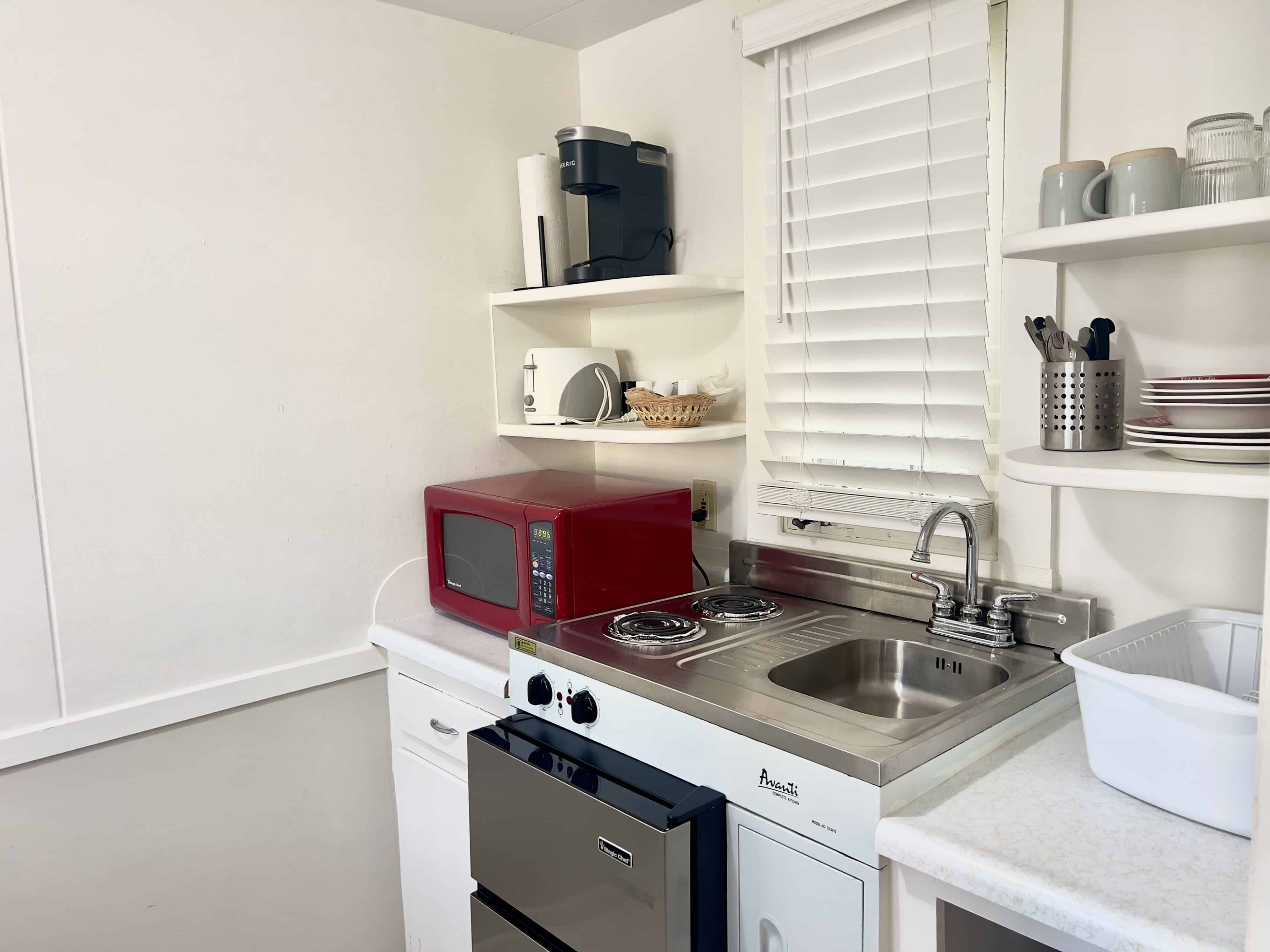 - Fully equipped efficiency kitchenettes, with dishes, utensils, paper towels, and coffee provided.