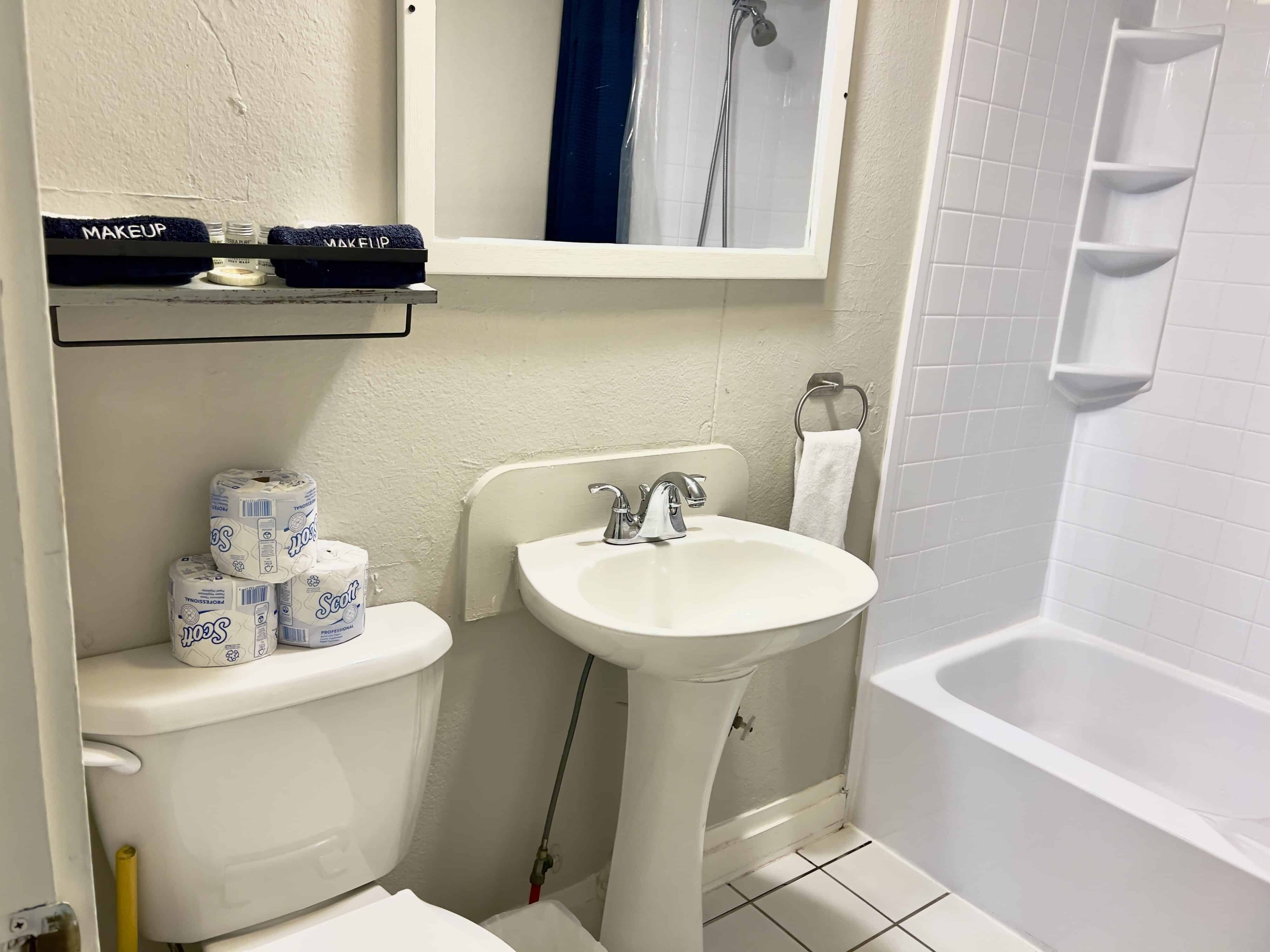 - Private baths with towels, basic soaps, and toilet paper provided.