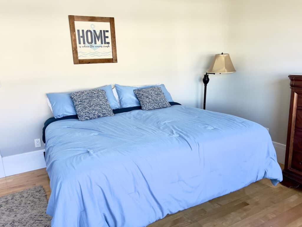 Bedroom 2 is next to the master and also enjoys ocean views. There’s a bathroom across the hall, as well as a laundry room. Bedroom 3 is down the hall and includes a bathroom with shower. All rooms have king beds. The main house sleeps up to 10 guests.
