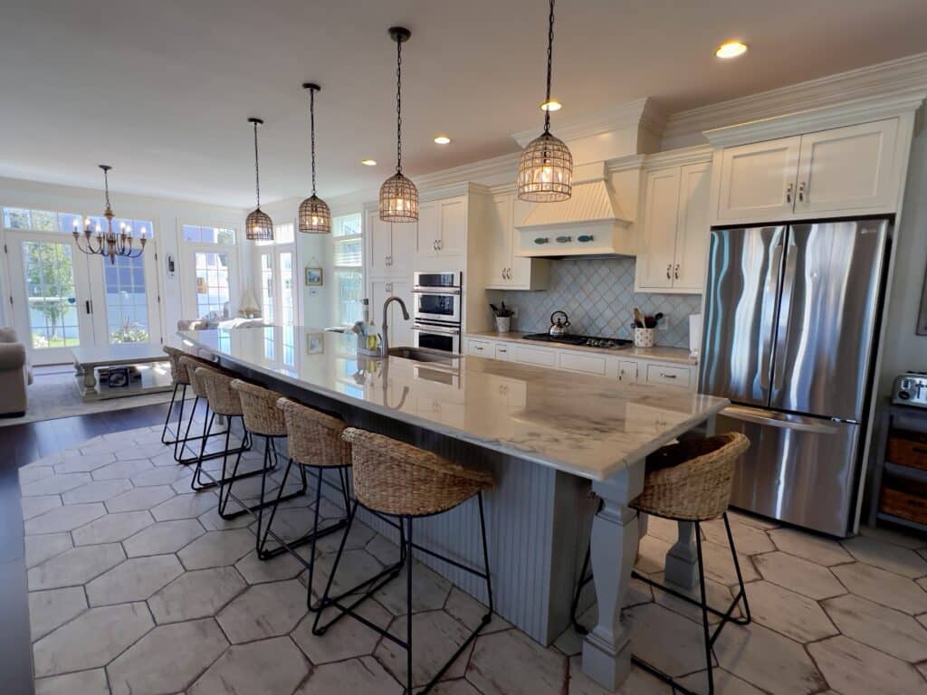 The 1st floor’s open floor plan makes for a very relaxing visit. The living room, dining room and kitchen with large island, open out onto the patio and gardens. In the kitchen you’ll find state of the art appliances and an island that comfortably seats 8. The dining room table sits another 10. A cozy sitting area with gas fireplace is a lovely spot to snuggle up by the fire or play a game.