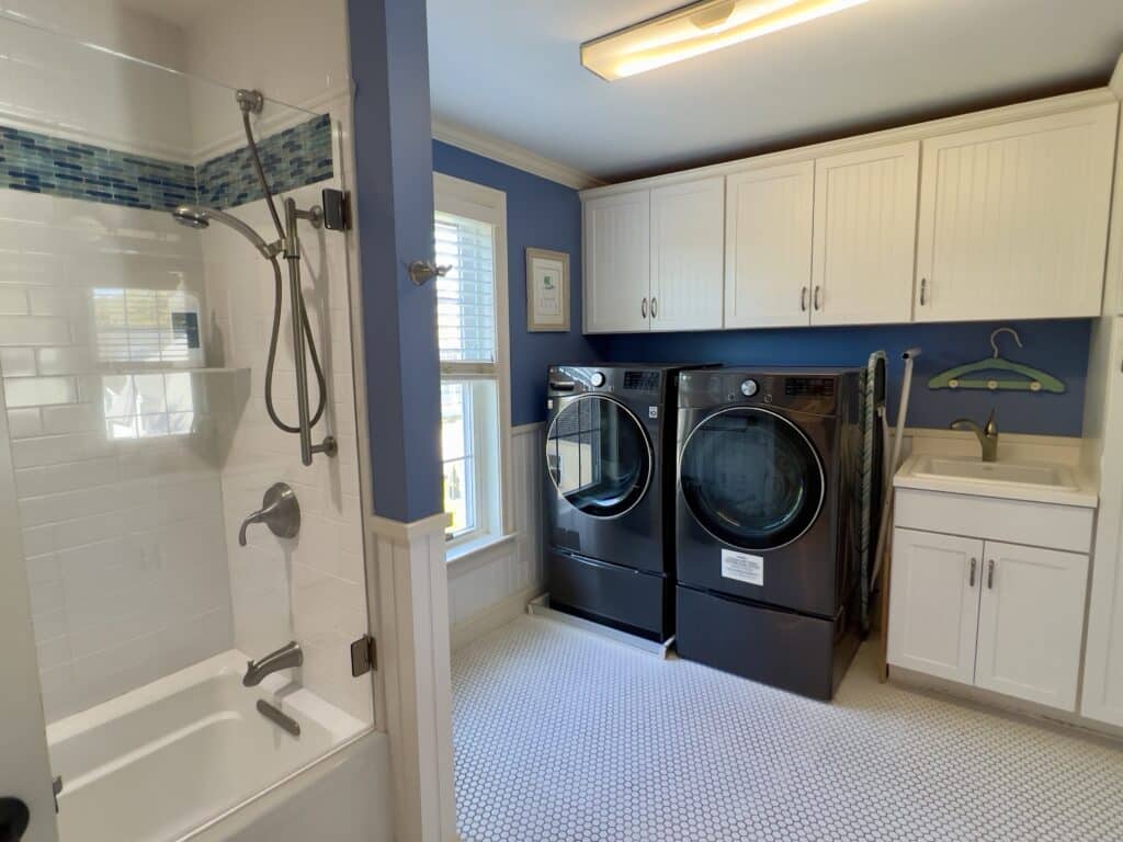 Across the living room to the other side of the upstairs area, you’ll come to room 4, the bunk room. The lower beds each have a trundle which open additional twin size mattresses for a total of 9 beds in the room. The upstairs bath has a tub/shower combo and also includes the home’s washer and dryer.