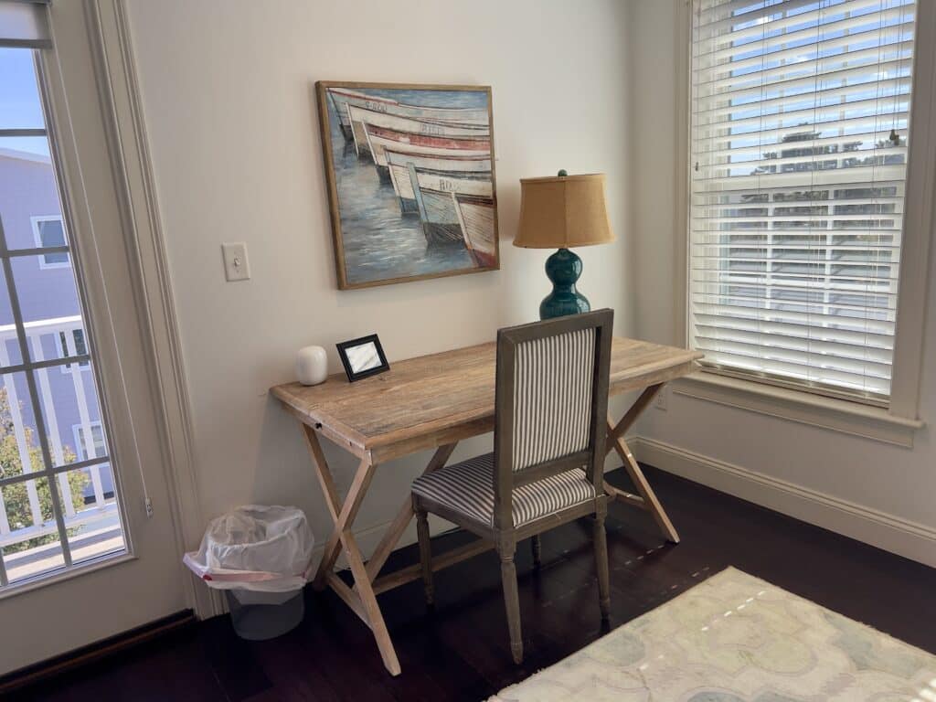 The 3rd floor features the home’s 2nd master suite. A large open space includes a couch, new Peloton bike, sitting area and desk space. The king size bed anchors the other side of the room.