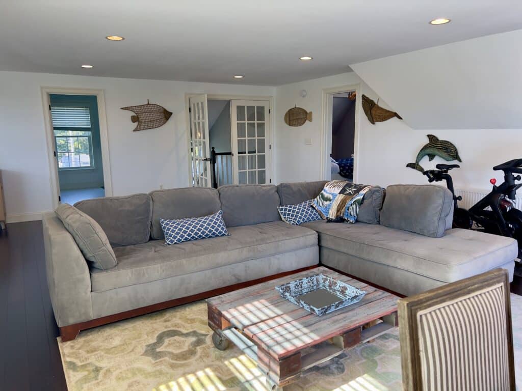 Downstairs in the basement you’ll find outdoor games, kayaks (2 single, 1 tandem), bikes, sand toys, corn hole, beach chairs, and boogie boards. The door leading to outside makes getting what you need quick and easy.